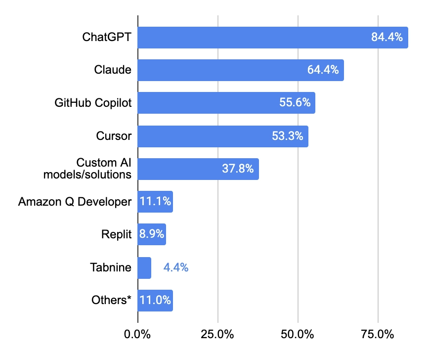 - ChatGPT is the de facto standard: 84.4% of respondents use it.
