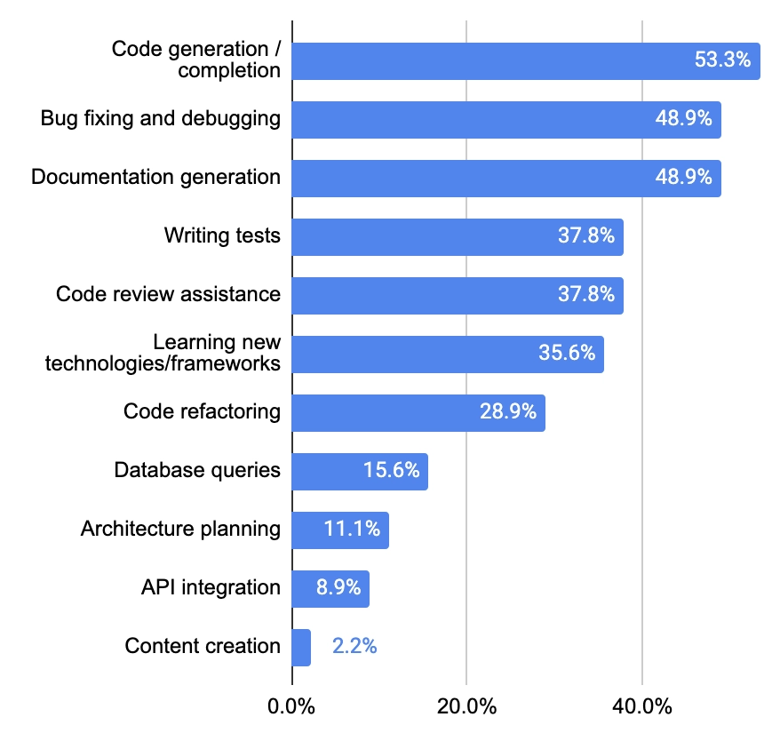 - Code gen/completion (53.3%) and debugging (48.9%) – fast pair-programmer for everyday tasks.