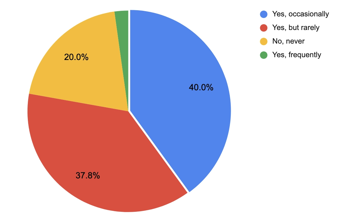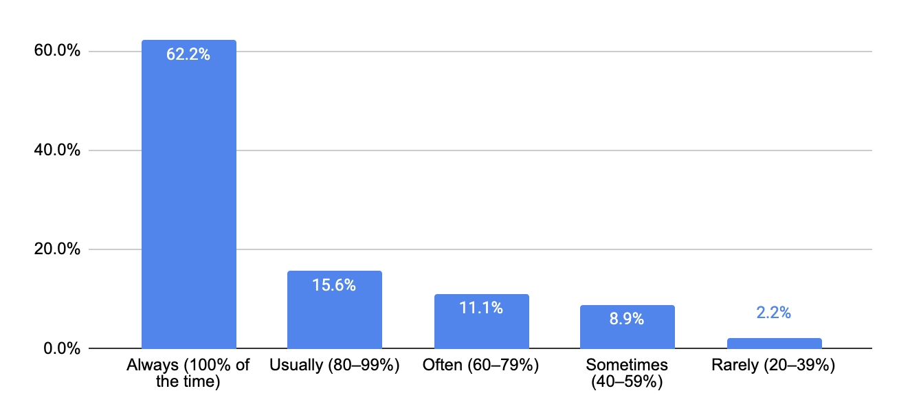 - Ethical incidents in using AI for coding are mostly episodic: 40.0% of respondents reported “occasionally” facing ethical dilemmas, 37.8% “rarely.”