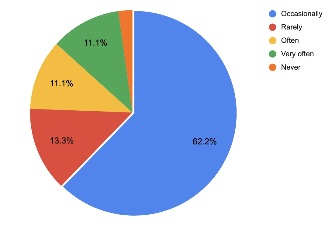 - 22.2% deal with bugs frequently (often and very often, each with 11.1%), so one in five works under a repeated correction load.