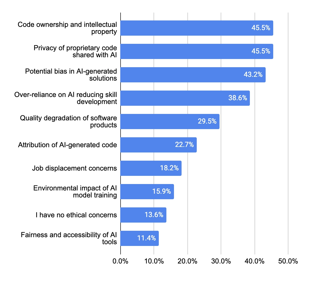 - Main concerns are legal and data-related: IP rights and code privacy (both 45.5%) dominate concerns, showing that teams fear legal exposure more than abstract ethics.